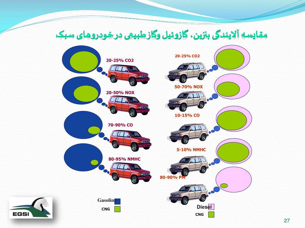 20-25% CO2 20-25% CO2 50-70% NOX 20-50% NOX 10-15% CO 70-90% CO 5-10% NMHC 80-95% NMHC 80-90% PM Gasoline Diesel CNG CNG مقایسه آلایندگی بنزین، گازوئیل وگاز طبیعی در خودروهای سبک