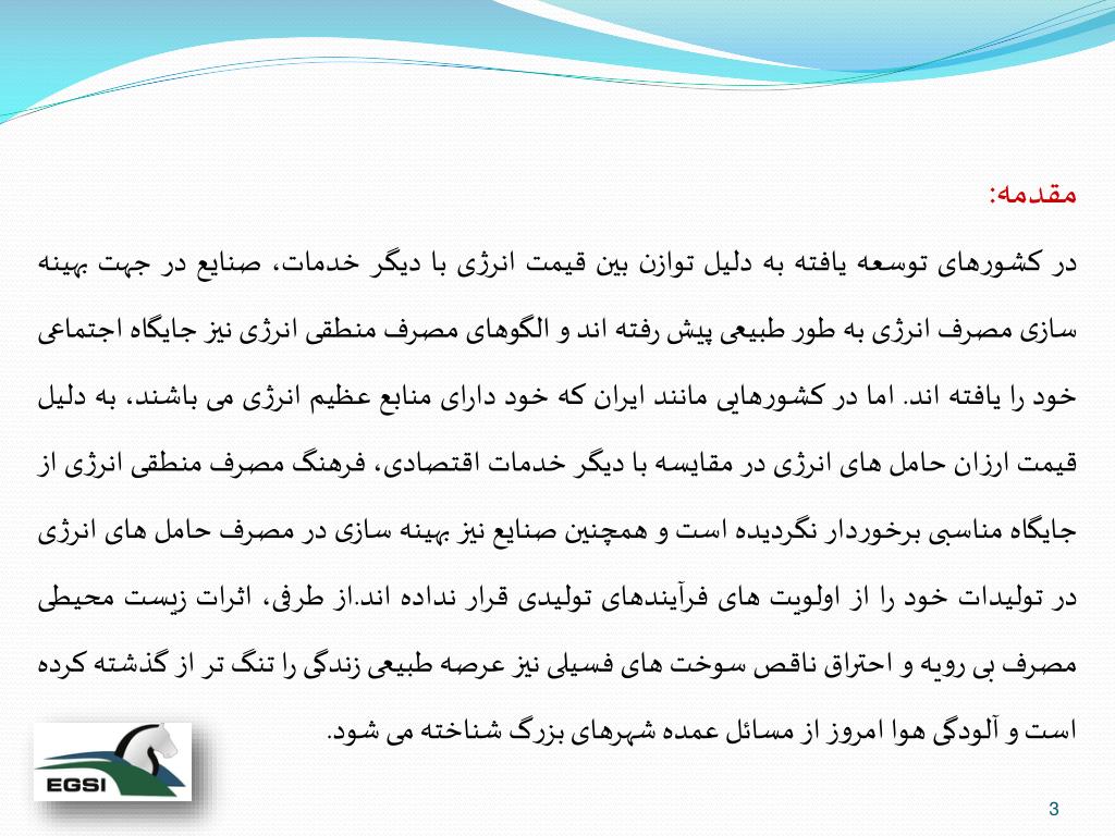 مقدمه: • در کشورهای توسعه یافته به دلیل توازن بین قیمت انرژی با دیگر خدمات، صنایع در جهت بهینه سازی مصرف انرژی به طور طبیعی پیش رفته اند و الگوهای مصرف منطقی انرژی نیز جایگاه اجتماعی خود را یافته اند. اما در کشورهایی مانند ایران که خود دارای منابع عظیم انرژی می باشند، به دلیل قیمت ارزان حامل های انرژی در مقایسه با دیگر خدمات اقتصادی، فرهنگ مصرف منطقی انرژی از جایگاه مناسبی برخوردار نگردیده است و همچنین صنایع نیز بهینه سازی در مصرف حامل های انرژی در تولیدات خود را از اولویت های فرآیندهای تولیدی قرار نداده اند.از طرفی، اثرات زیست محیطی مصرف بی رویه و احتراق ناقص سوخت های فسیلی نیز عرصه طبیعی زندگی را تنگ تر از گذشته کرده است و آلودگی هوا امروز از مسائل عمده شهرهای بزرگ شناخته می شود.