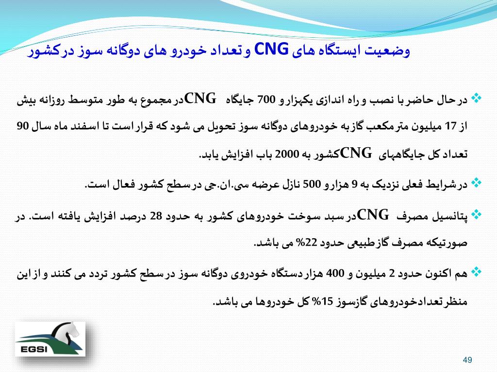 وضعیت ایستگاه های CNG و تعداد خودرو های دوگانه سوز در کشور • در حال حاضر با نصب و راه اندازی یکهزار و 700 جایگاه CNG در مجموع به طور متوسط روزانه بیش از 17 میلیون متر مکعب گاز به خودروهای دوگانه سوز تحویل می شود که قرار است تا اسفند ماه سال 90 تعداد کل جایگاههای CNG کشور به 2000 باب افزایش یابد. • در شرایط فعلی نزدیک به 9 هزار و 500 نازل عرضه سی.ان.جی در سطح کشور فعال است. • پتانسیل مصرف CNG در سبد سوخت خودروهای کشور به حدود 28 درصد افزایش یافته است. در صورتیکه مصرف گاز طبیعی حدود 22% می باشد. • هم اکنون حدود 2 میلیون و 400 هزار دستگاه خودروی دوگانه سوز در سطح کشور تردد می کنند و از این منظر تعدادخودروهای گازسوز 15% کل خودروها می باشد.