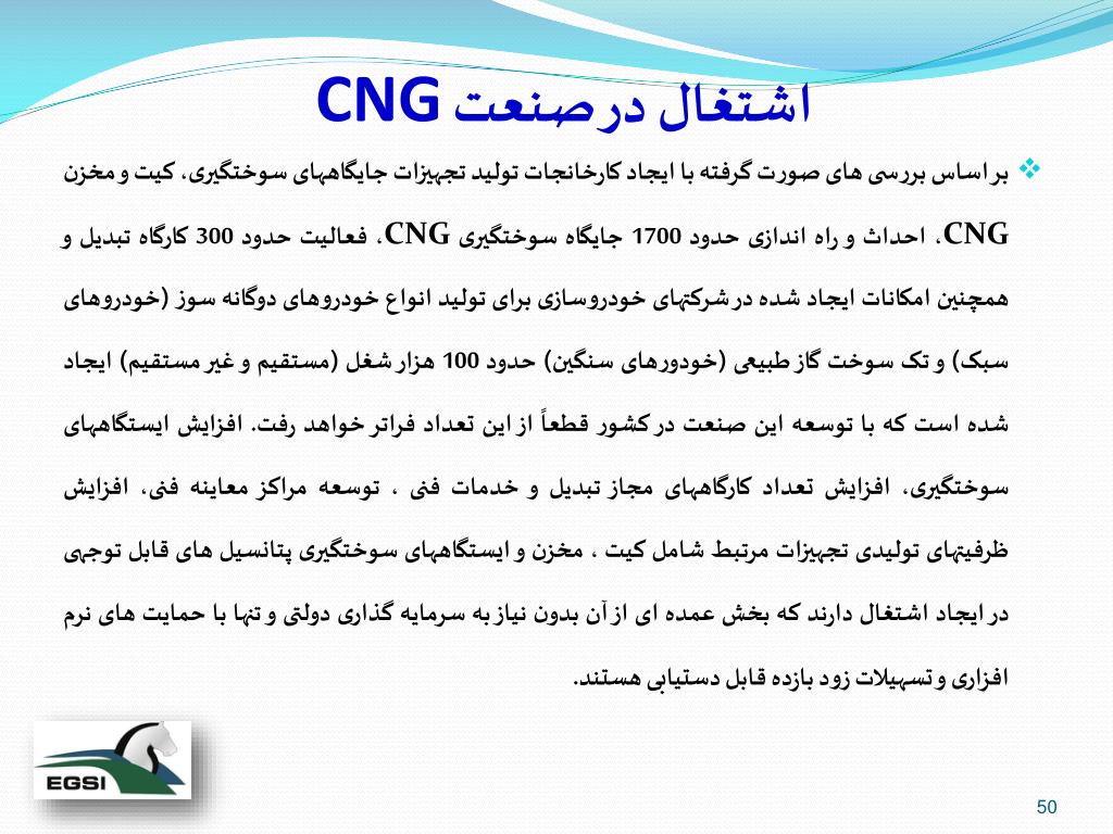 اشتغال در صنعت CNG • بر اساس بررسی های صورت گرفته با ایجاد کارخانجات تولید تجهیزات جایگاههای سوختگیری، کیت و مخزن CNG، احداث و راه اندازی حدود 1700 جایگاه سوختگیری CNG، فعالیت حدود 300 کارگاه تبدیل و همچنین امکانات ایجاد شده در شرکتهای خودروسازی برای تولید انواع خودروهای دوگانه سوز (خودروهای سبک) و تک سوخت گاز طبیعی (خودورهای سنگین) حدود 100 هزار شغل (مستقیم و غیر مستقیم) ایجاد شده است که با توسعه این صنعت در کشور قطعاً از این تعداد فراتر خواهد رفت. افزایش ایستگاههای سوختگیری، افزایش تعداد کارگاههای مجاز تبدیل و خدمات فنی ، توسعه مراکز معاینه فنی، افزایش ظرفیتهای تولیدی تجهیزات مرتبط شامل کیت ، مخزن و ایستگاههای سوختگیری پتانسیل های قابل توجهی در ایجاد اشتغال دارند که بخش عمده ای از آن بدون نیاز به سرمایه گذاری دولتی و تنها با حمایت های نرم افزاری و تسهیلات زود بازده قابل دستیابی هستند.