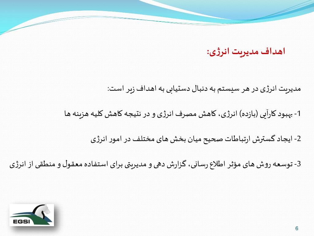 اهداف مدیریت انرژی: مدیریت انرژی در هر سیستم به دنبال دستیابی به اهداف زیر است: 1- بهبود کارآیی (بازده) انرژی، کاهش مصرف انرژی و در نتیجه کاهش کلیه هزینه ها 2- ایجاد گسترش ارتباطات صحیح میان بخش های مختلف در امور انرژی 3- توسعه روش های مؤثر اطلاع رسانی، گزارش دهی و مدیریتی برای استفاده معقول و منطقی از انرژی