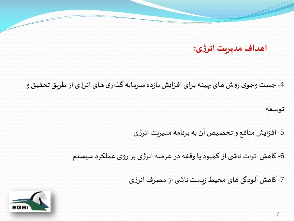 اهداف مدیریت انرژی: • 4- جست وجوی روش های بهینه برای افزایش بازده سرمایه گذاری های انرژی از طریق تحقیق و توسعه • 5- افزایش منافع و تخصیص آن به برنامه مدیریت انرژی • 6- کاهش اثرات ناشی از کمبود یا وقفه در عرضه انرژی بر روی عملکرد سیستم • 7- کاهش آلودگی های محیط زیست ناشی از مصرف انرژی