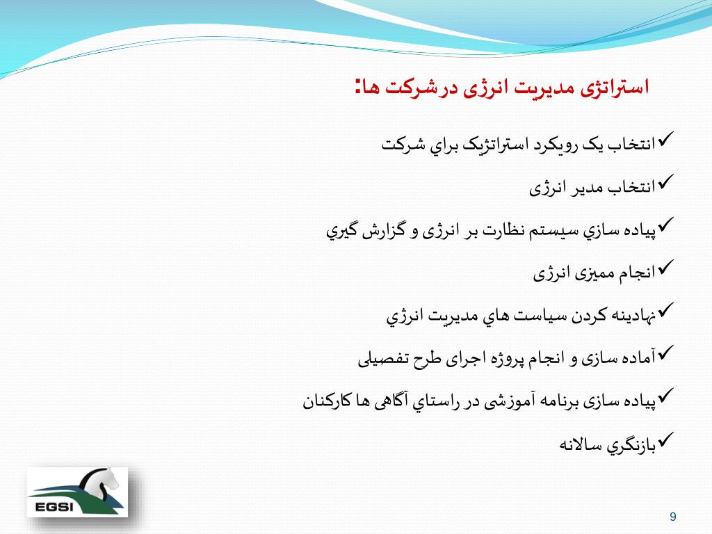 استراتژی مدیریت انرژی در شركت ها : • انتخاب یک رویکرد استراتژیک براي شرکت • انتخاب مدیر انرژی • پياده سازي سیستم نظارت بر انرژی و گزارش گيري • انجام ممیزی انرژی • نهادينه كردن سياست هاي مديريت انرژي • آماده سازی و انجام پروژه اجرای طرح تفصیلی • پیاده سازی برنامه آموزشی در راستاي آگاهی ها كاركنان • بازنگري سالانه