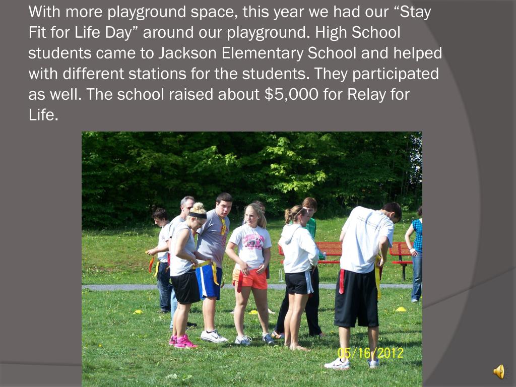 With more playground space, this year we had our “Stay Fit for Life Day” around our playground. High School students came to Jackson Elementary School and helped with different stations for the students. They participated as well. The school raised about $5,000 for Relay for Life.