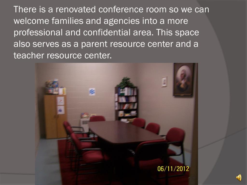 There is a renovated conference room so we can welcome families and agencies into a more professional and confidential area. This space also serves as a parent resource center and a teacher resource center.