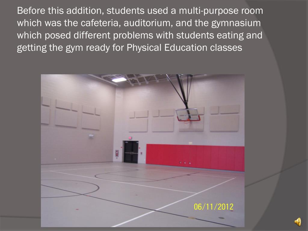 Before this addition, students used a multi-purpose room which was the cafeteria, auditorium, and the gymnasium which posed different problems with students eating and getting the gym ready for Physical Education classes
