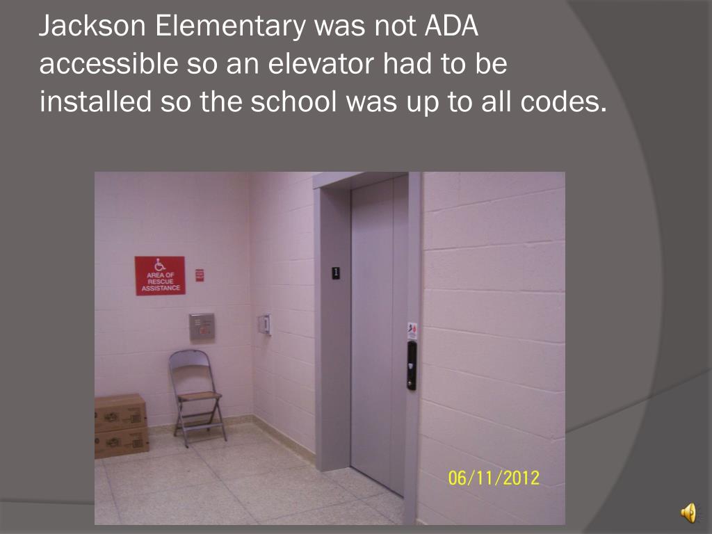 Jackson Elementary was not ADA accessible so an elevator had to be installed so the school was up to all codes.