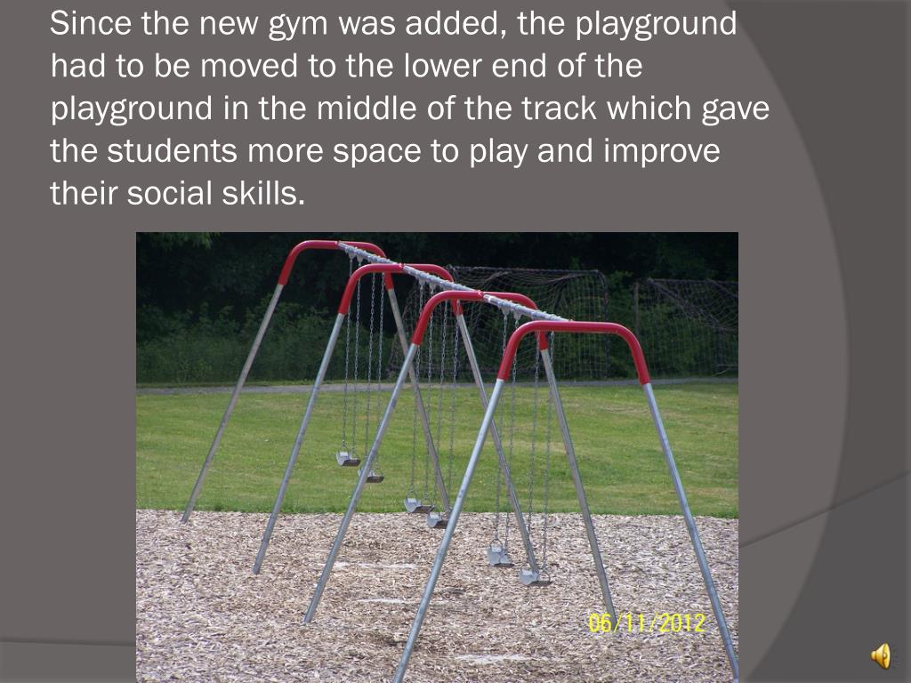 Since the new gym was added, the playground had to be moved to the lower end of the playground in the middle of the track which gave the students more space to play and improve their social skills.