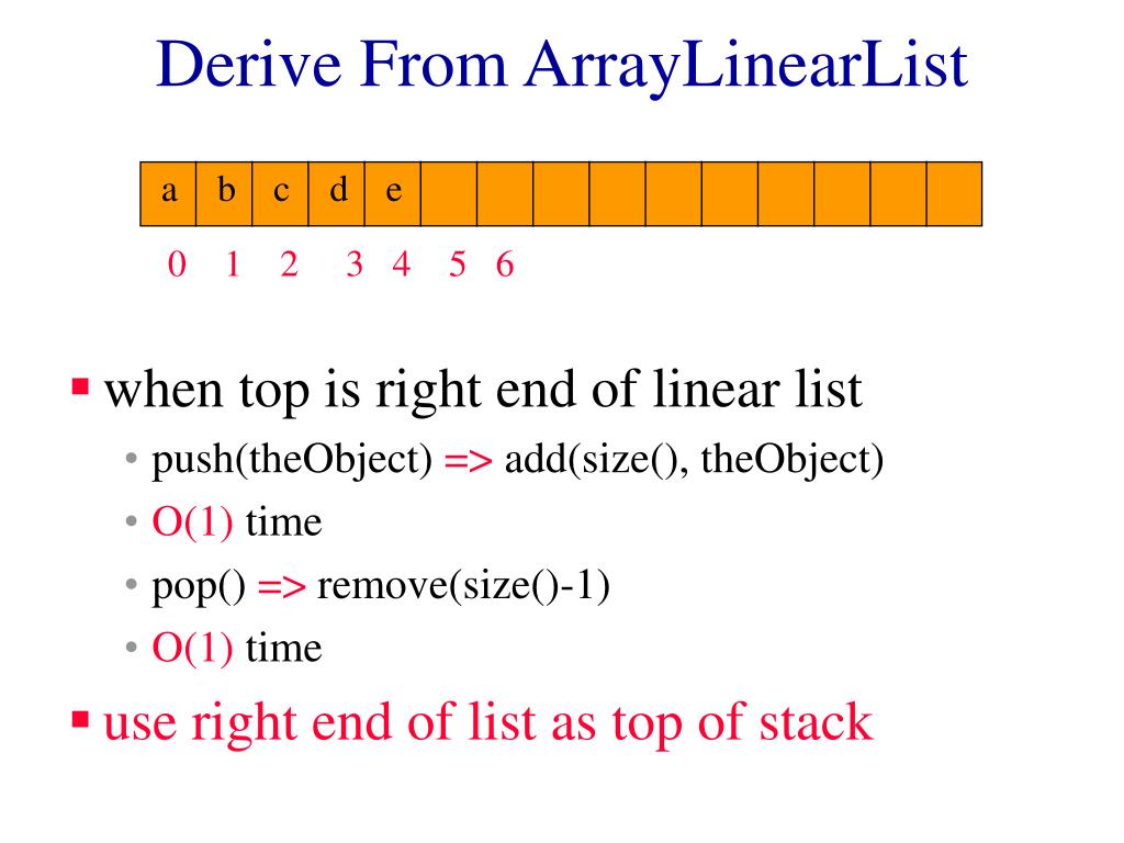 a b c d e 0 1 2 3 4 5 6 Derive From ArrayLinearList • when top is right end of linear list • push(theObject) => add(size(), theObject) • O(1) time • pop() => remove(size()-1) • O(1) time • use right end of list as top of stack