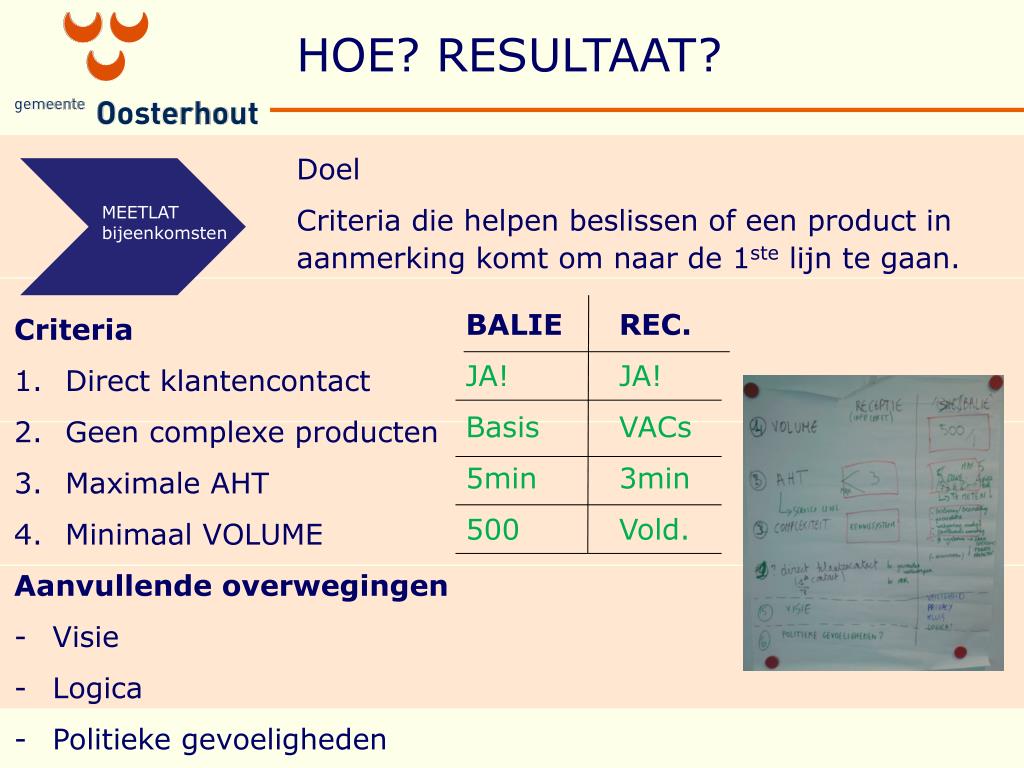 HOE? RESULTAAT? Doel Criteria die helpen beslissen of een product in aanmerking komt om naar de 1ste lijn te gaan. MEETLAT bijeenkomsten BALIE JA! Basis 5min 500 REC. JA! VACs 3min Vold. Criteria • Direct klantencontact • Geen complexe producten • Maximale AHT • Minimaal VOLUME Aanvullende overwegingen • Visie • Logica • Politieke gevoeligheden