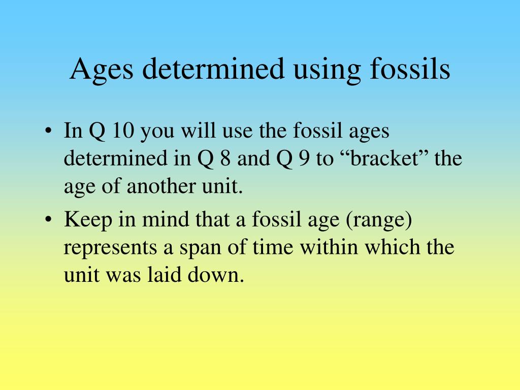Ages determined using fossils • In Q 10 you will use the fossil ages determined in Q 8 and Q 9 to “bracket” the age of another unit. • Keep in mind that a fossil age (range) represents a span of time within which the unit was laid down.