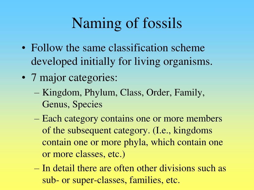 Naming of fossils • Follow the same classification scheme developed initially for living organisms. • 7 major categories: • Kingdom, Phylum, Class, Order, Family,Genus, Species • Each category contains one or more members of the subsequent category. (I.e., kingdoms contain one or more phyla, which contain one or more classes, etc.) • In detail there are often other divisions such as sub- or super-classes, families, etc.