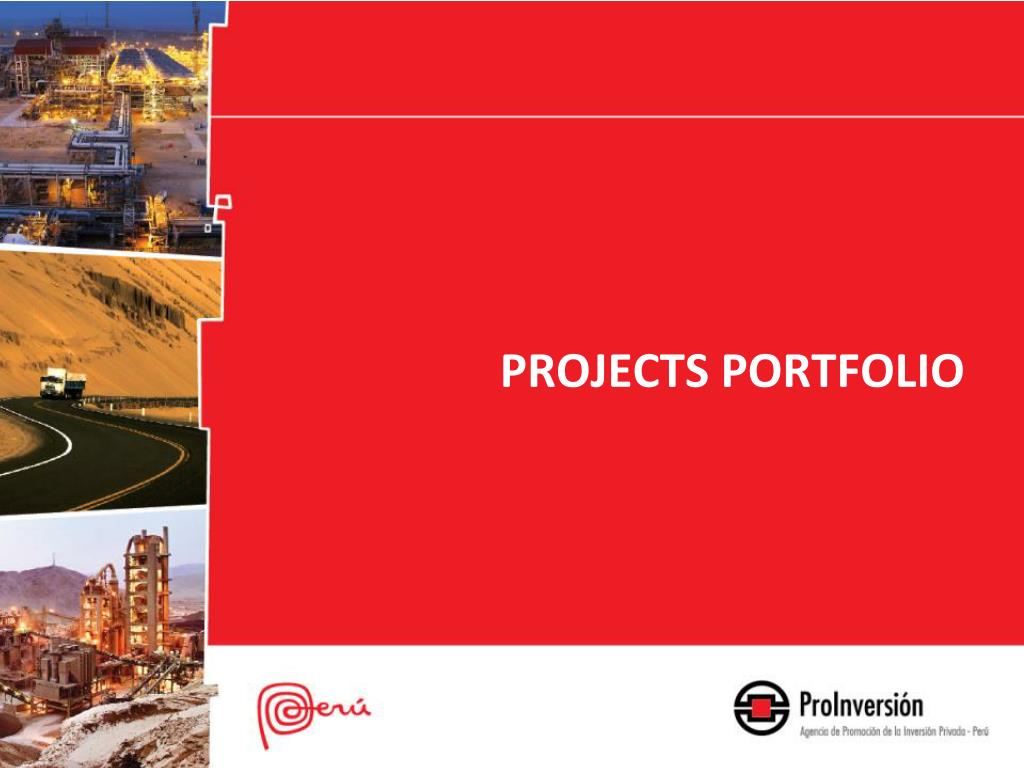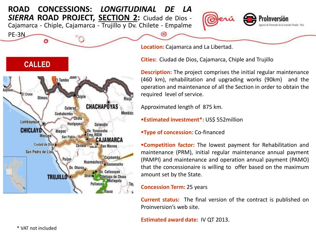 ROAD CONCESSIONS: LONGITUDINAL DE LA SIERRA ROAD PROJECT, SECTION 2: Ciudad de Dios - Cajamarca - Chiple, Cajamarca - Trujillo y Dv. Chilete - Empalme PE-3N • Location: Cajamarca and La Libertad. • Cities: Ciudad de Dios, Cajamarca, Chiple and Trujillo • Description: The project comprises the initial regular maintenance (460 km), rehabilitation and upgrading works (90km) and the operation and maintenance of all the Section in order to obtain the required level of service. • Approximated length of 875 km. • Estimated investment*: US$ 552million • Type of concession: Co-financed • Competition factor: The lowest payment for Rehabilitation and maintenance (PRM), initial regular maintenance annual payment (PAMPI) and maintenance and operation annual payment (PAMO) that the concessionaire is willing to offer based on the maximum amount set by the State. • Concession Term: 25 years • Current status: The final version of the contract is published on Proinversion’s web site. • Estimated award date: IV QT 2013. CALLED * VAT not included