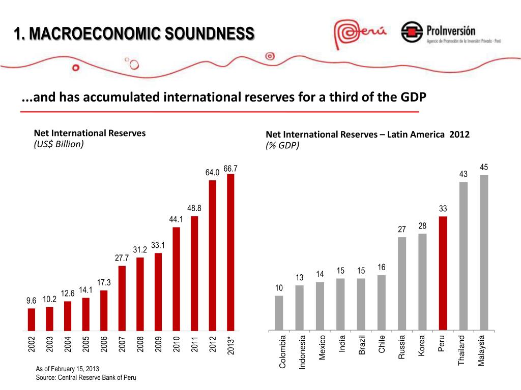 MACROECONOMICSOUNDNESS ...and has accumulated international reserves for a third of the GDP Net International Reserves (US$ Billion) Net International Reserves – Latin America 2012 (% GDP) Colombia Indonesia Mexico India Brazil Chile Russia Korea Peru Thailand Malaysia As of February 15, 2013 Source: Central Reserve Bank of Peru