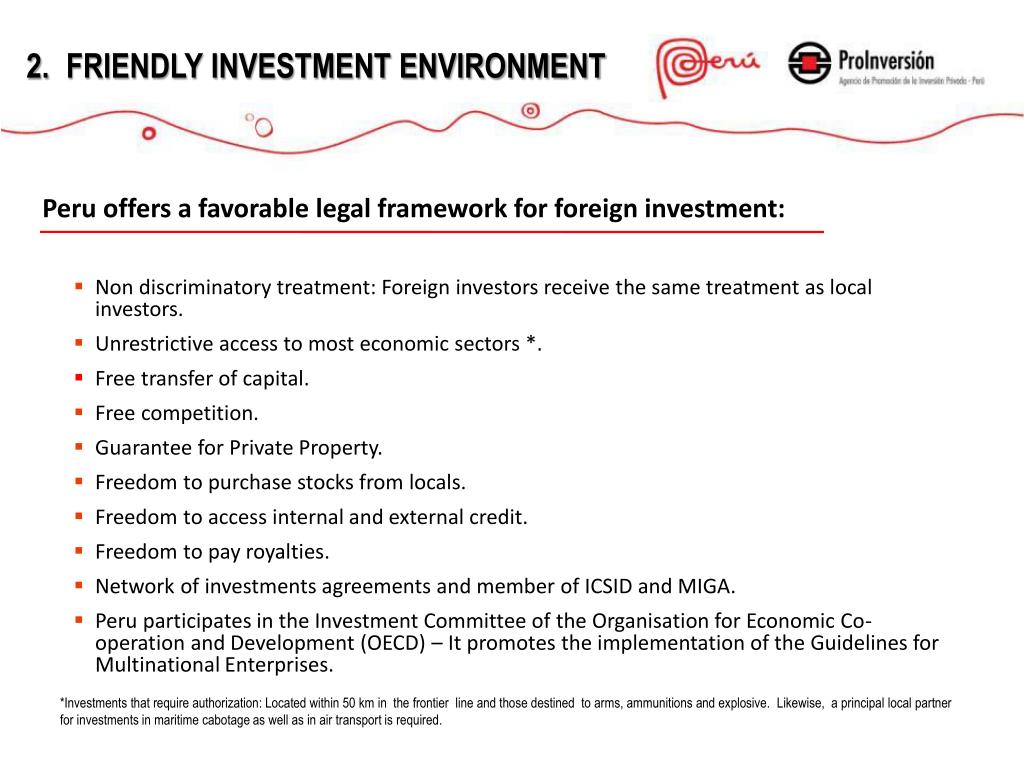 FRIENDLY INVESTMENT ENVIRONMENT Peru offers a favorable legal framework for foreign investment: • Non discriminatory treatment: Foreign investors receive the same treatment as local investors. • Unrestrictive access to most economic sectors *. • Free transfer of capital. • Free competition. • Guarantee for Private Property. • Freedom to purchase stocks from locals. • Freedom to access internal and external credit. • Freedom to pay royalties. • Network of investments agreements and member of ICSID and MIGA. • Peru participates in the Investment Committee of the Organisation for Economic Co-operation and Development (OECD) – It promotes the implementation of the Guidelines for Multinational Enterprises. *Investments that require authorization: Located within 50 km in the frontier line and those destined to arms, ammunitions and explosive. Likewise, a principal local partner for investments in maritime cabotage as well as in air transport is required.