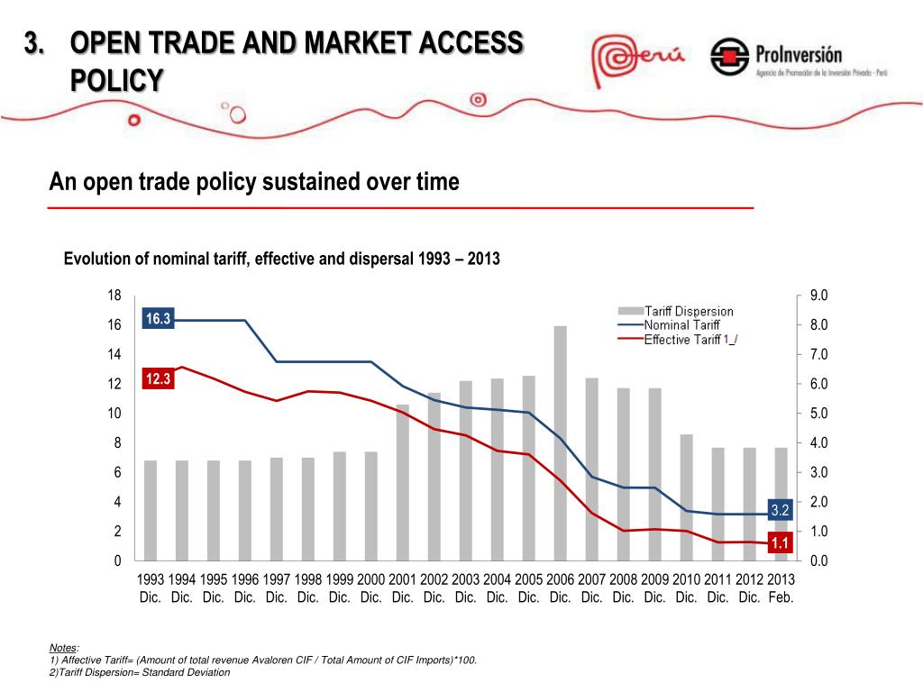 OPENTRADEANDMARKETACCESSPOLICY An open tradepolicysustainedover time Evolution of nominal tariff, effective and dispersal 1993 – 2013 Notes: 1) Affective Tariff= (Amount of total revenue Avaloren CIF / Total Amount of CIF Imports)*100. 2)Tariff Dispersion= Standard Deviation
