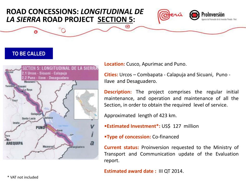 ROAD CONCESSIONS: LONGITUDINAL DE LA SIERRA ROAD PROJECT SECTION 5: TO BE CALLED • Location: Cusco, Apurimac and Puno. • Cities: Urcos – Combapata - Calapuja and Sicuani, Puno - Ilave and Desaguadero. • Description: The project comprises the regular initial maintenance, and operation and maintenance of all the Section, in order to obtain the required level of service. • Approximated length of 423 km. • Estimated Investment*: US$ 127 million • Type of concession: Co-financed • Current status: Proinversion requested to the Ministry of Transport and Communication update of the Evaluation report. • Estimated award date : III QT 2014. * VAT not included