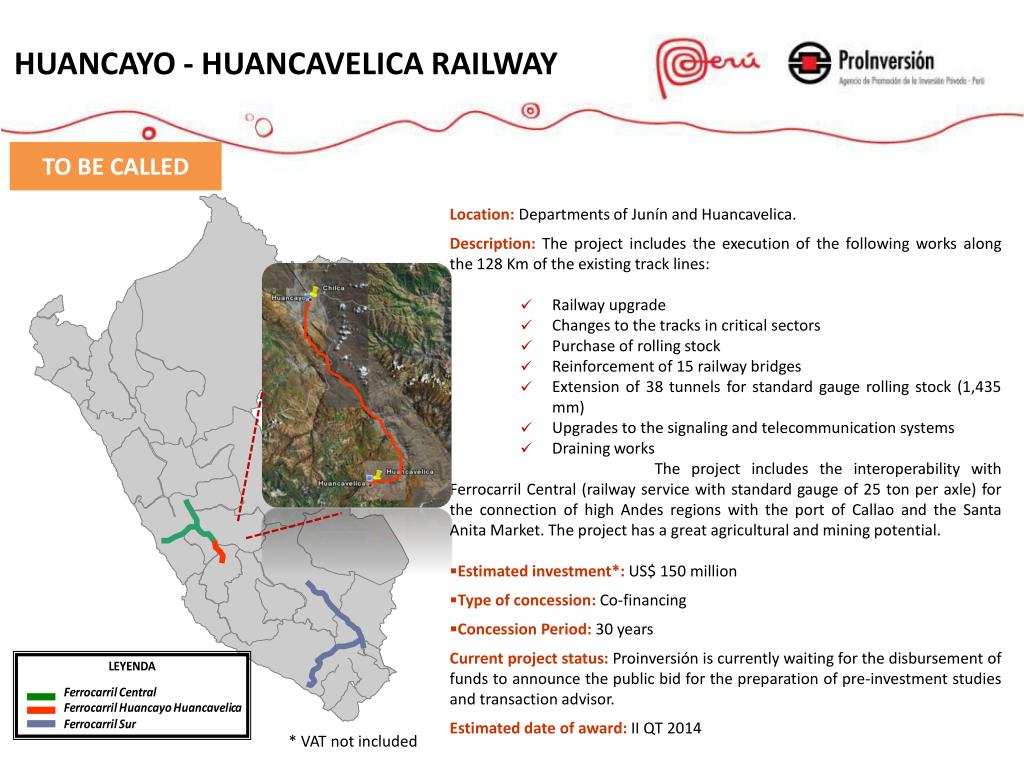 HUANCAYO - HUANCAVELICA RAILWAY TO BE CALLED • Location: Departments of Junín and Huancavelica. • Description: The project includes the execution of the following works along the 128 Km of the existing track lines: • Railway upgrade • Changes to the tracks in critical sectors • Purchase of rolling stock • Reinforcement of 15 railway bridges • Extension of 38 tunnels for standard gauge rolling stock (1,435 mm) • Upgrades to the signaling and telecommunication systems • Draining works • The project includes the interoperability with Ferrocarril Central (railway service with standard gauge of 25 ton per axle) for the connection of high Andes regions with the port of Callao and the Santa Anita Market. The project has a great agricultural and mining potential. • Estimated investment*: US$ 150 million • Type of concession: Co-financing • Concession Period: 30 years • Current project status: Proinversión is currently waiting for the disbursement of funds to announce the public bid for the preparation of pre-investment studies and transaction advisor. • Estimated date of award: II QT 2014 * VAT not included