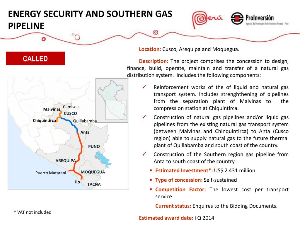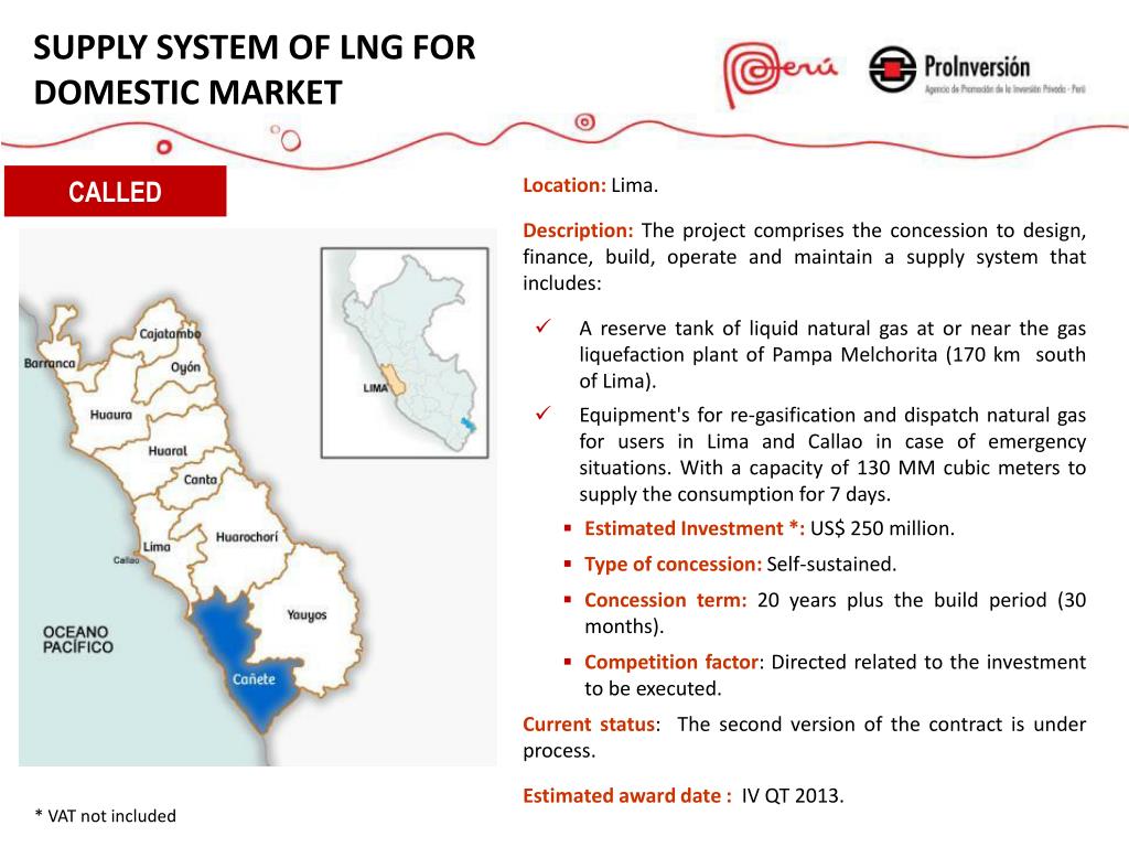 SUPPLY SYSTEM OF LNG FOR DOMESTIC MARKET CALLED • Location: Lima. • Description: The project comprises the concession to design, finance, build, operate and maintain a supply system that includes: • A reserve tank of liquid natural gas at or near the gas liquefaction plant of Pampa Melchorita (170 km south of Lima). • Equipment's for re-gasification and dispatch natural gas for users in Lima and Callao in case of emergency situations. With a capacity of 130 MM cubic meters to supply the consumption for 7 days. • Estimated Investment *: US$ 250 million. • Type of concession: Self-sustained. • Concession term: 20 years plus the build period (30 months). • Competition factor: Directed related to the investment to be executed. • Current status: The second version of the contract is under process. • Estimated award date : IV QT 2013. * VAT not included