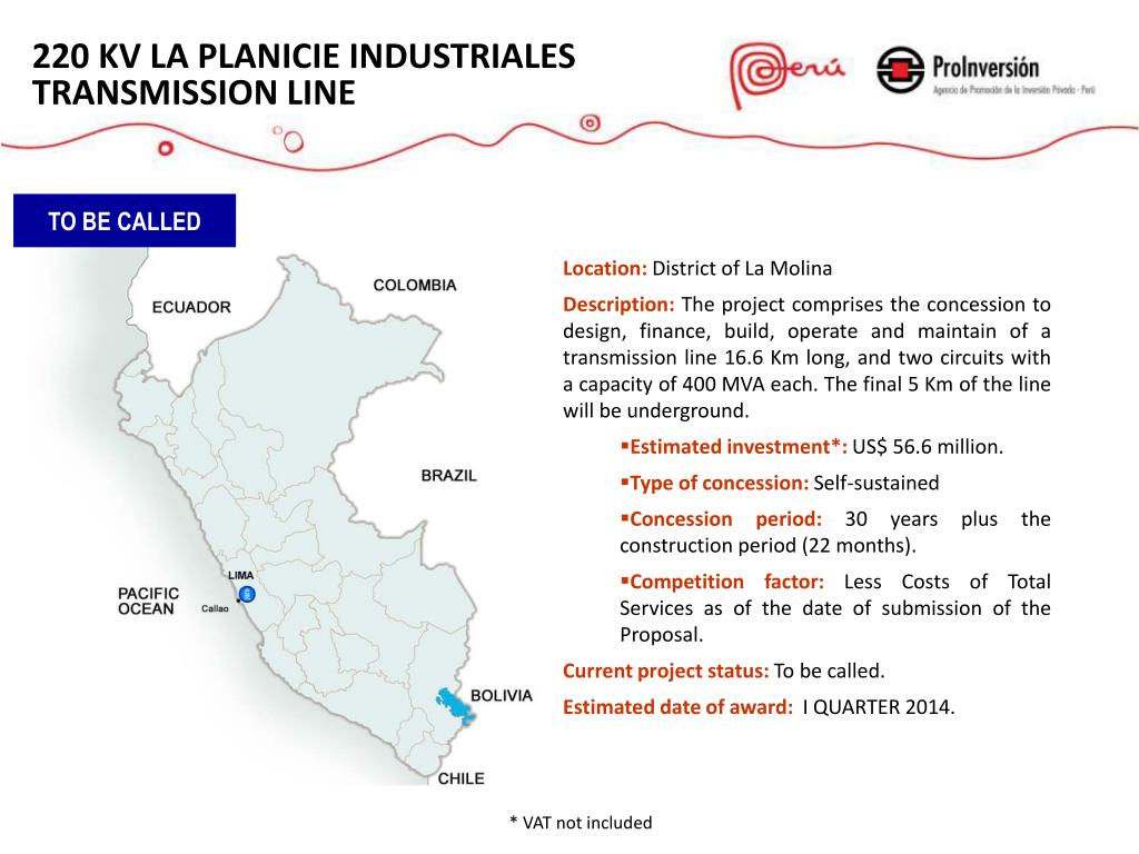 220 KV LA PLANICIE INDUSTRIALES TRANSMISSION LINE TO BE CALLED • Location: District of La Molina • Description: The project comprises the concession to design, finance, build, operate and maintain of a transmission line 16.6 Km long, and two circuits with a capacity of 400 MVA each. The final 5 Km of the line will be underground. • Estimated investment*: US$ 56.6 million. • Type of concession: Self-sustained • Concession period: 30 years plus the construction period (22 months). • Competition factor: Less Costs of Total Services as of the date of submission of the Proposal. • Current project status: To be called. • Estimated date of award: I QUARTER 2014. * VAT not included