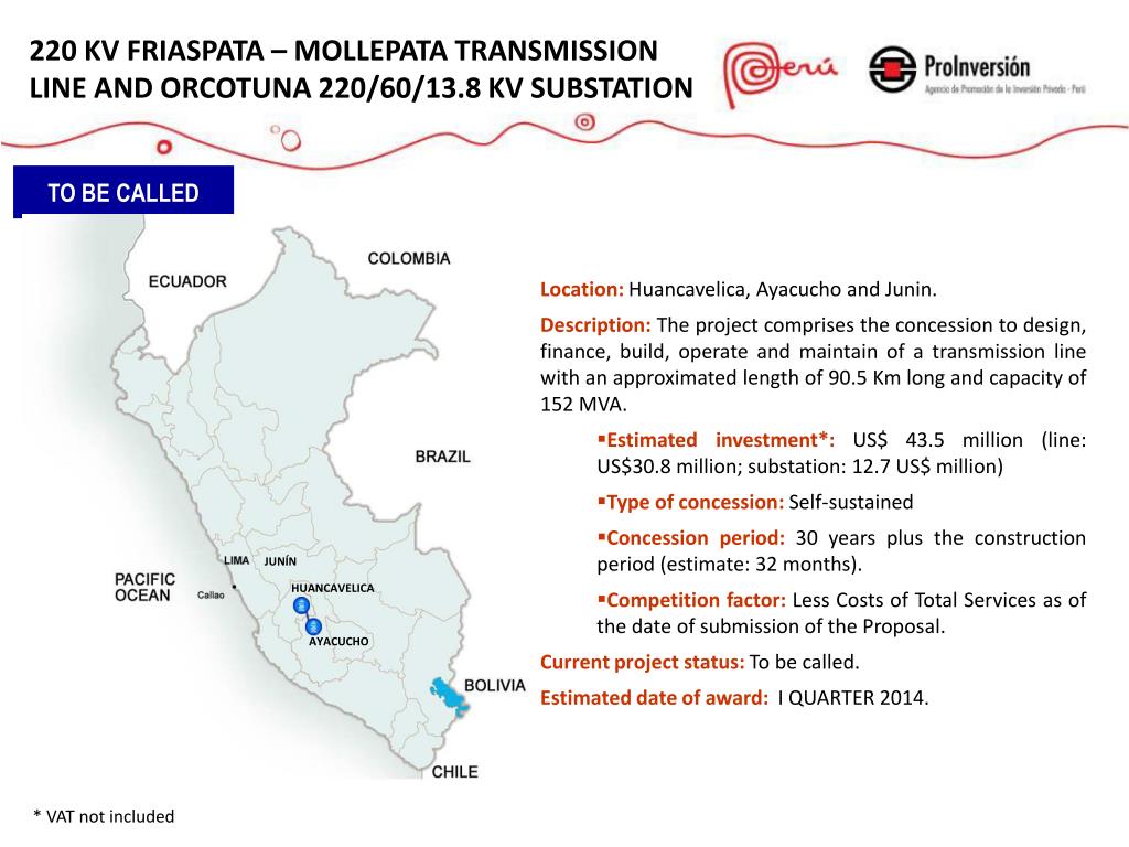 220 KV FRIASPATA – MOLLEPATA TRANSMISSION LINE AND ORCOTUNA 220/60/13.8 KV SUBSTATION TO BE CALLED • Location: Huancavelica, Ayacucho and Junin. • Description: The project comprises the concession to design, finance, build, operate and maintain of a transmission line with an approximated length of 90.5 Km long and capacity of 152 MVA. • Estimated investment*: US$ 43.5 million (line: US$30.8 million; substation: 12.7 US$ million) • Type of concession: Self-sustained • Concession period: 30 years plus the construction period (estimate: 32 months). • Competition factor: Less Costs of Total Services as of the date of submission of the Proposal. • Current project status: To be called. • Estimated date of award: I QUARTER 2014. JUNÍN HUANCAVELICA AYACUCHO * VAT not included