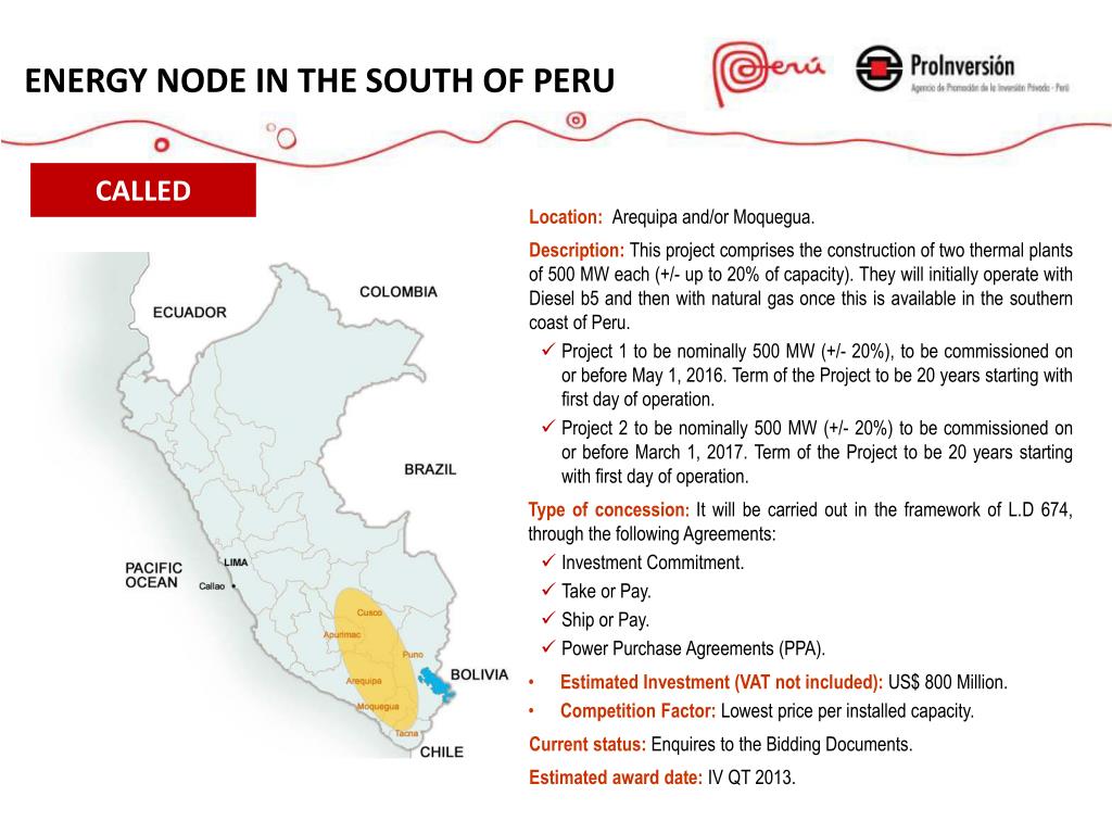 ENERGY NODE IN THE SOUTH OF PERU CALLED • Location: Arequipa and/or Moquegua. • Description: This project comprises the construction of two thermal plants of 500 MW each (+/- up to 20% of capacity). They will initially operate with Diesel b5 and then with natural gas once this is available in the southern coast of Peru. • Project 1 to be nominally 500 MW (+/- 20%), to be commissioned on or before May 1, 2016. Term of the Project to be 20 years starting with first day of operation. • Project 2 to be nominally 500 MW (+/- 20%) to be commissioned on or before March 1, 2017. Term of the Project to be 20 years starting with first day of operation. • Type of concession: It will be carried out in the framework of L.D 674, through the following Agreements: • Investment Commitment. • Take or Pay. • Ship or Pay. • Power Purchase Agreements (PPA). • Estimated Investment (VAT not included): US$ 800 Million. • Competition Factor: Lowest price per installed capacity. • Current status: Enquires to the Bidding Documents. • Estimated award date: IV QT 2013.