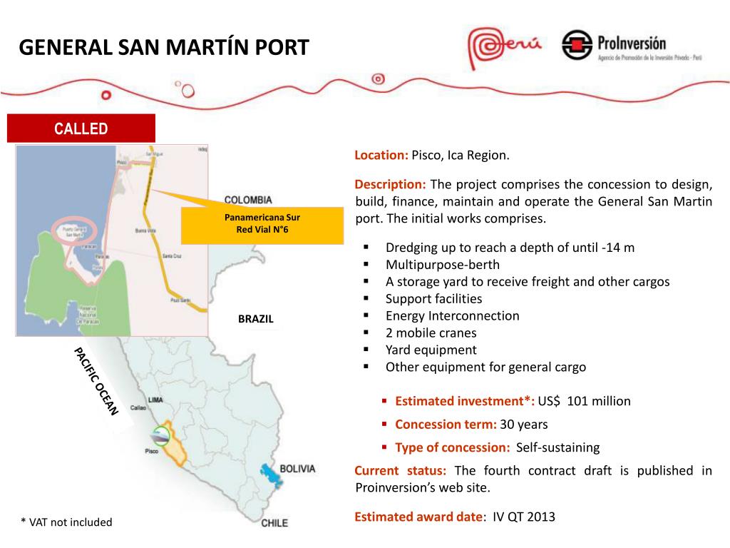 Panamericana Sur Red Vial N°6 GENERAL SAN MARTÍN PORT CALLED • Location: Pisco, Ica Region. • Description: The project comprises the concession to design, build, finance, maintain and operate the General San Martin port. The initial works comprises. • Dredging up to reach a depth of until -14 m • Multipurpose-berth • A storage yard to receive freight and other cargos • Support facilities • Energy Interconnection • 2 mobile cranes • Yard equipment • Other equipment for general cargo • Estimated investment*: US$ 101 million • Concession term: 30 years • Type of concession: Self-sustaining • Current status: The fourth contract draft is published in Proinversion’s web site. • Estimated award date: IV QT 2013 BRAZIL PACIFIC OCEAN * VAT not included