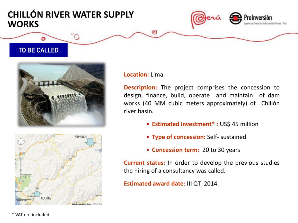 CHILLÓN RIVER WATER SUPPLY WORKS TO BE CALLED POR CONVOCAR • Location: Lima. • Description: The project comprises the concession to design, finance, build, operate and maintain of dam works (40 MM cubic meters approximately) of Chillón river basin. • Estimated investment* : US$ 45 million • Type of concession: Self- sustained • Concession term: 20 to 30 years • Current status: In order to develop the previous studies the hiring of a consultancy was called. • Estimated award date: III QT 2014. * VAT not included