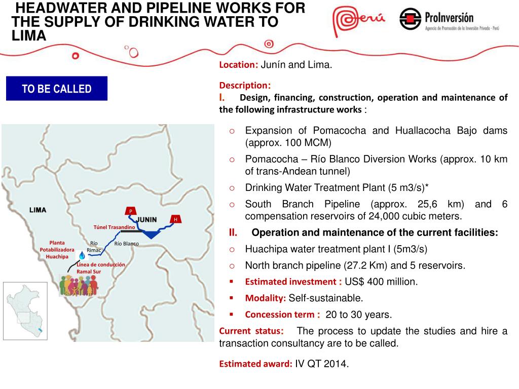 HEADWATER AND PIPELINE WORKS FOR THE SUPPLY OF DRINKING WATER TO LIMA • Location:Junín and Lima. • Description: • I. Design, financing, construction, operation and maintenance of the following infrastructure works : • Expansion of Pomacocha and Huallacocha Bajo dams (approx. 100 MCM) • Pomacocha – Río Blanco Diversion Works (approx. 10 km of trans-Andean tunnel) • Drinking Water Treatment Plant (5 m3/s)* • South Branch Pipeline (approx. 25,6 km) and 6 compensation reservoirs of 24,000 cubic meters. • Operation and maintenance of the current facilities: • Huachipa water treatment plant I (5m3/s) • North branch pipeline (27.2 Km) and 5 reservoirs. • Estimated investment : US$ 400 million. • Modality:Self-sustainable. • Concession term : 20 to 30 years. • Current status: The process to update the studies and hire a transaction consultancy are to be called. • Estimated award:IV QT 2014. TO BE CALLED POR CONVOCAR P H Túnel Trasandino Río Blanco Planta Potabilizadora Huachipa Río Rimac Línea de conducción Ramal Sur
