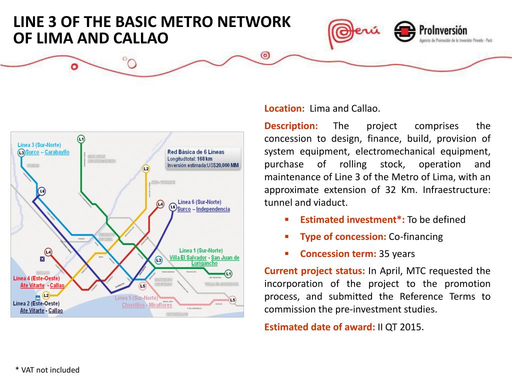 LINE 4 OF THE BASIC METRO NETWORK OF LIMA AND CALLAO • Location: Lima and Callao. • Description:The project comprises the concession to design, finance, build, provision of system equipment, electromechanical equipment, purchase of rolling stock, operation and maintenance of Line 4 of the Metro of Lima, with an approximate extension of 30 Km. Infraestructure: tunnel. • Estimated investment: To be defined • Type of concession: Co-financing • Concession term : 35 years • Current project status: In June, MTC requested the incorporation of the project to the promotion process, and submitted the Reference Terms to commission the pre-investment studies. • Estimated date of award: III QUARTER 2015. * VAT not included