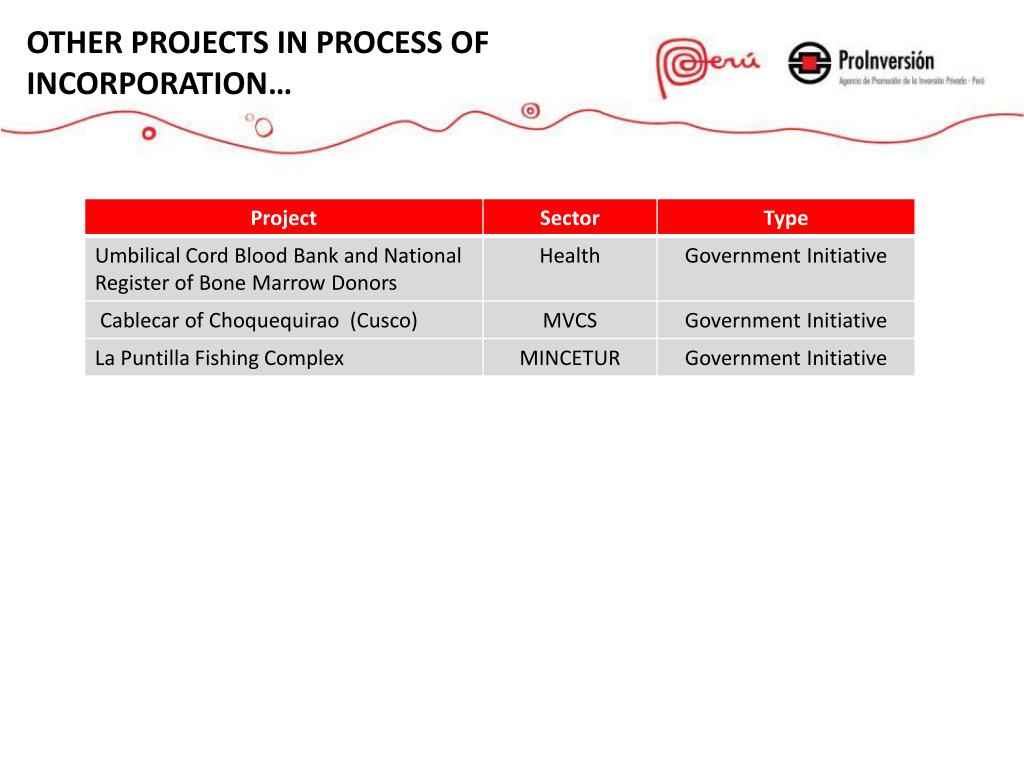 NEW INTERNATIONAL AIRPORT OF CHINCHERO – CUSCO CALLED • Location: Chinchero and Huayllabamba districts, Urubamba Province , Cusco Region. • Description: The project comprises the concession to design, build, finance, operate and maintain the new international airport of Chinchero – Cusco. • Estimated investment*: US$ 556 million • Type of concession: Co-financed • Competition factor: To be defined • Concession term: 40 years • Current status: The pre investments studies on profile level are published on Proinversion’s web site. • Estimated award date: IV QT 2013. * VAT not included