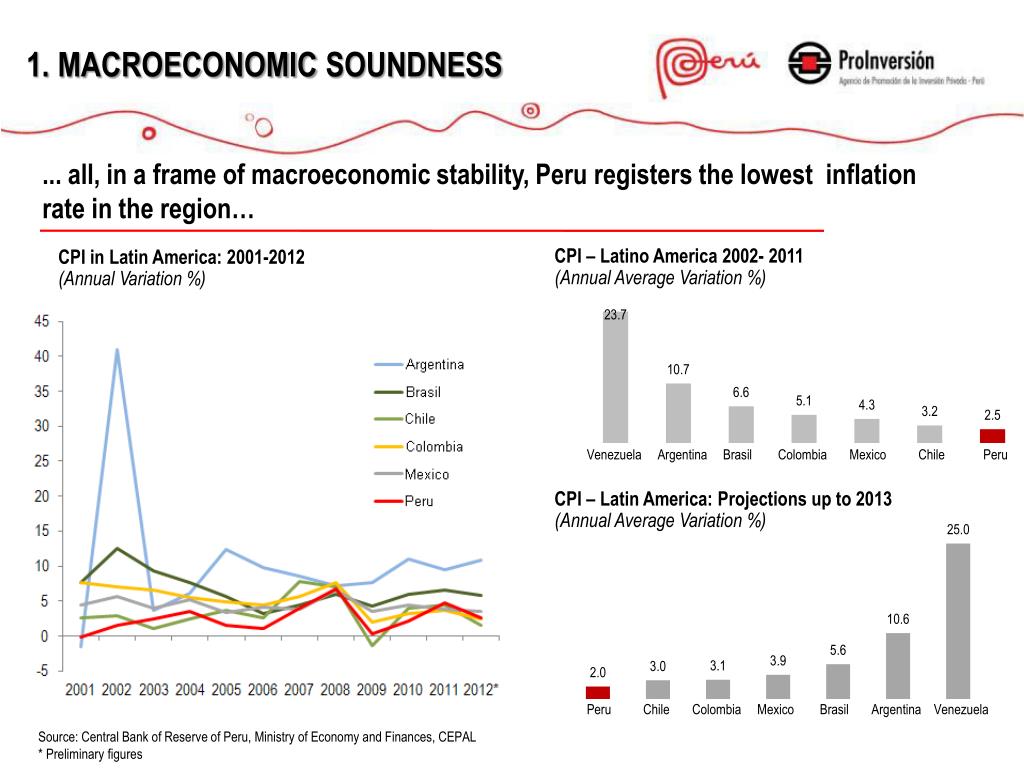 MACROECONOMICSOUNDNESS ... all, in a frame of macroeconomic stability, Peru registers the lowest inflation rate in the region… CPI – Latino America 2002- 2011 (Annual Average Variation %) CPI in Latin America: 2001-2012 (Annual Variation %) Venezuela Argentina Brasil Colombia Mexico Chile Peru CPI – Latin America: Projections up to 2013 (Annual Average Variation %) Peru Chile Colombia Mexico Brasil Argentina Venezuela Source: Central Bank of Reserve of Peru, Ministry of Economy and Finances, CEPAL * Preliminary figures