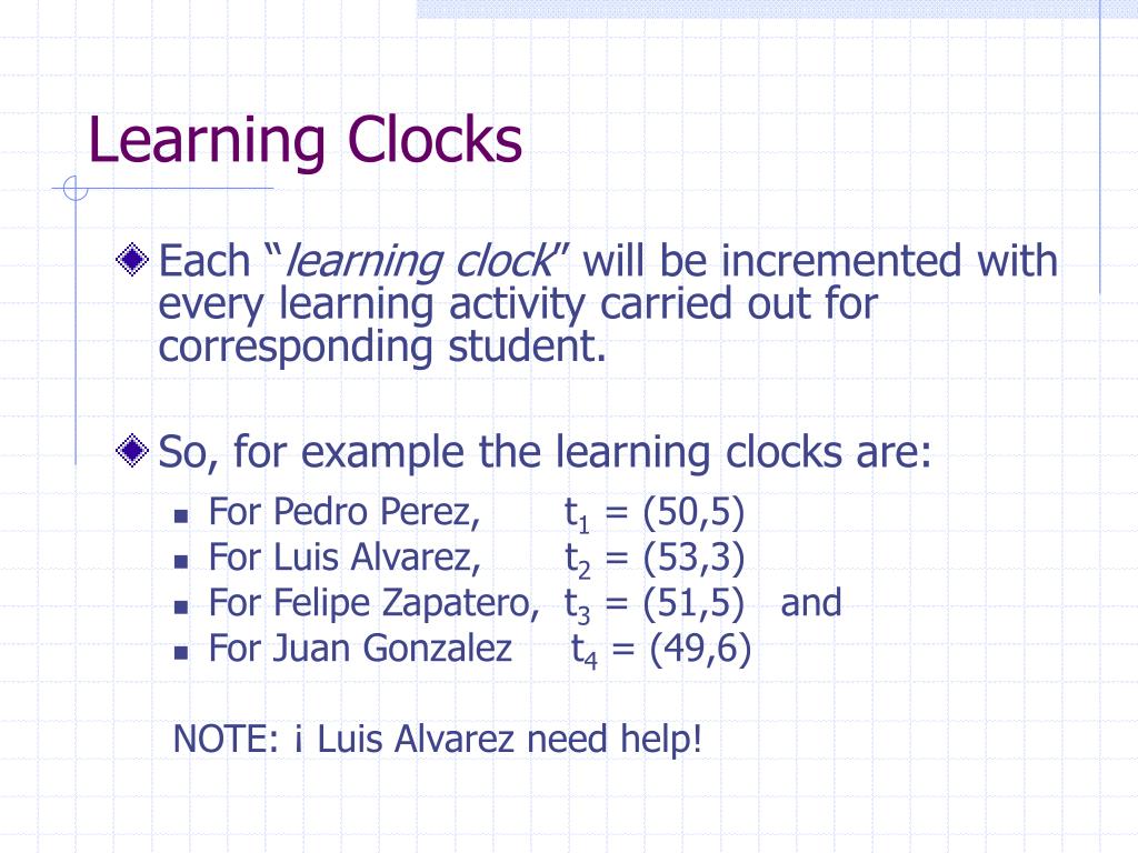 Learning Clocks • Each “learning clock” will be incremented with every learning activity carried out for corresponding student. • So, for example the learning clocks are: • For Pedro Perez, t1 = (50,5) • For Luis Alvarez, t2 = (53,3) • For Felipe Zapatero, t3 = (51,5) and • For Juan Gonzalez t4 = (49,6) NOTE: ¡ Luis Alvarez need help!