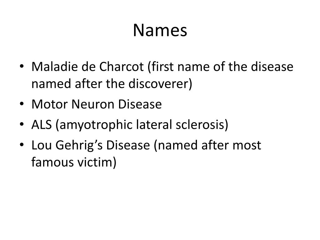 Names • Maladie de Charcot (first name of the disease named after the discoverer) • Motor Neuron Disease • ALS (amyotrophic lateral sclerosis) • Lou Gehrig’s Disease (named after most famous victim)