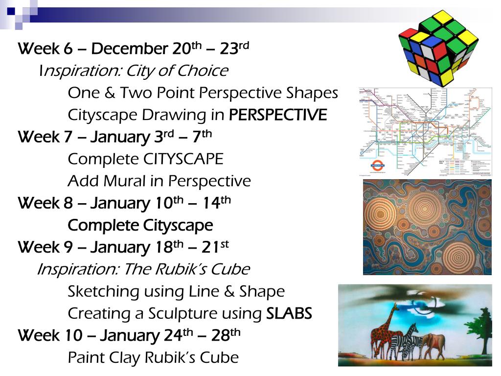 Week 6 – December 20th – 23rd Inspiration: City of Choice One & Two Point Perspective Shapes Cityscape Drawing in PERSPECTIVE Week 7 – January 3rd – 7th Complete CITYSCAPE Add Mural in Perspective Week 8 – January 10th – 14th Complete Cityscape Week 9 – January 18th – 21st Inspiration: The Rubik’s Cube Sketching using Line & Shape Creating a Sculpture using SLABS Week 10 – January 24th – 28th Paint Clay Rubik’s Cube