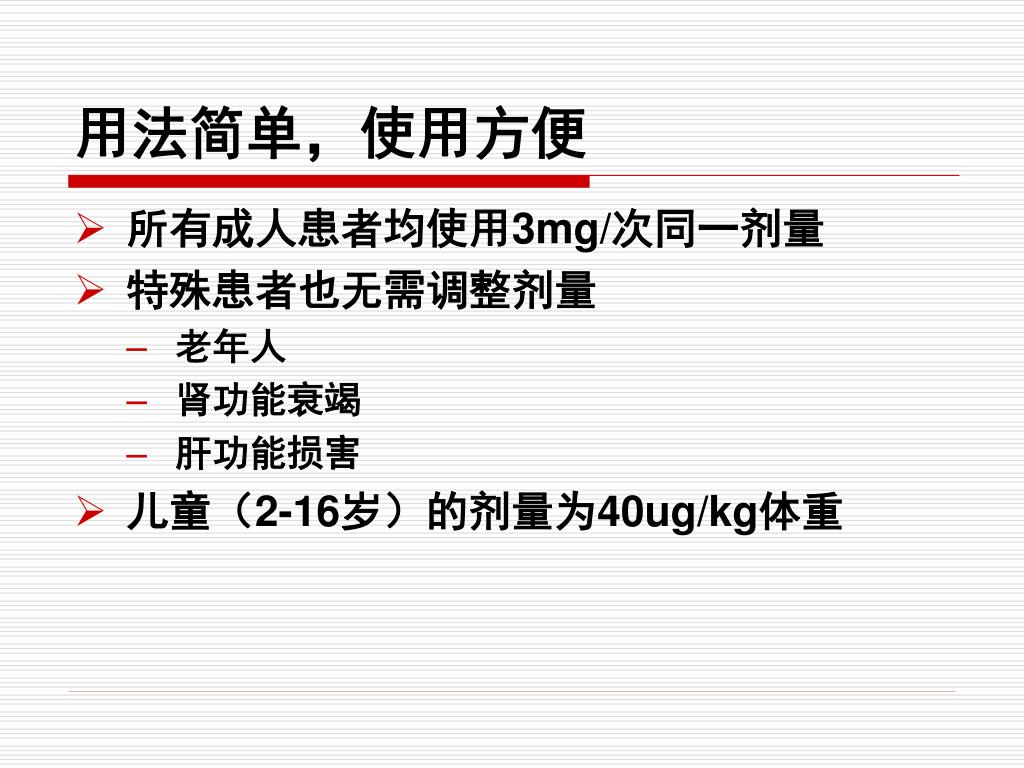 用法简单,使用方便 • 所有成人患者均使用3mg/次同一剂量 • 特殊患者也无需调整剂量 • 老年人 • 肾功能衰竭 • 肝功能损害 • 儿童(2-16岁)的剂量为40ug/kg体重