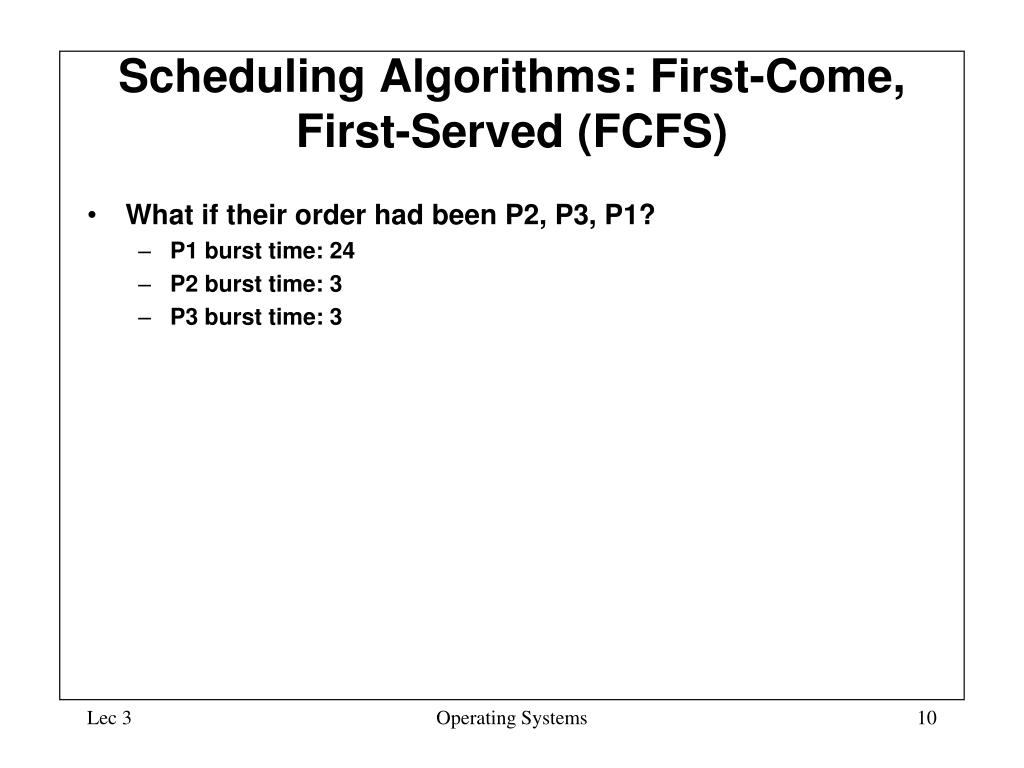 Scheduling Algorithms: First-Come, First-Served (FCFS) • What if their order had been P2, P3, P1? • P1 burst time: 24 • P2 burst time: 3 • P3 burst time: 3 Operating Systems