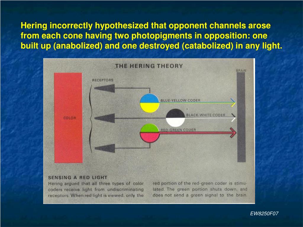 Hering incorrectly hypothesized that opponent channels arose from each cone having two photopigments in opposition: one built up (anabolized) and one destroyed (catabolized) in any light. EW8250F07