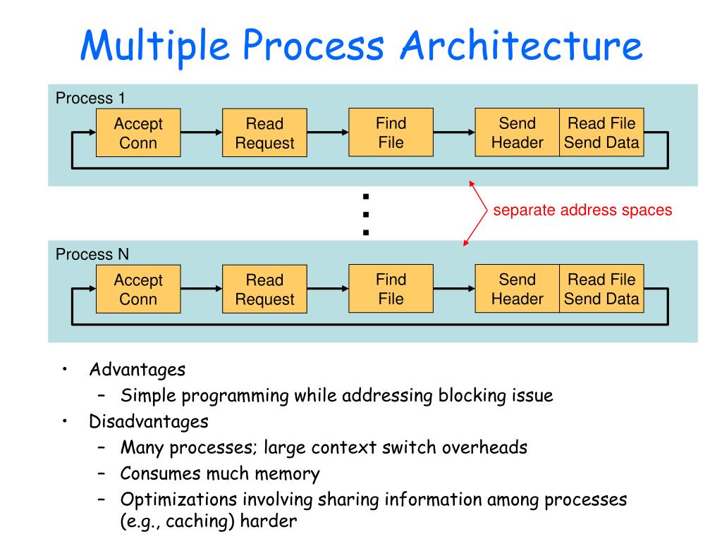 Find File Find File Send Header Send Header Read File Send Data Read File Send Data Accept Conn Accept Conn Read Request Read Request Multiple Process Architecture Process 1 • Advantages • Simple programming while addressing blocking issue • Disadvantages • Many processes; large context switch overheads • Consumes much memory • Optimizations involving sharing information among processes (e.g., caching) harder … separate address spaces Process N