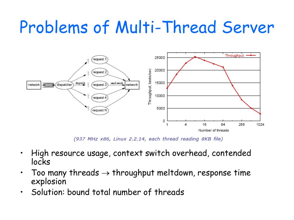 Problems of Multi-Thread Server • High resource usage, context switch overhead, contended locks • Too many threads throughput meltdown, response time explosion • Solution: bound total number of threads