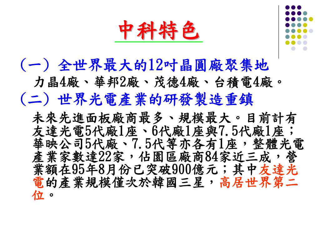 中科特色 (一) 全世界最大的12吋晶圓廠聚集地 力晶4廠、華邦2廠、茂德4廠、台積電4廠。 (二) 世界光電產業的研發製造重鎮 .未來先進面板廠商最多、規模最大。目前計有友達光電5代廠1座、6代廠1座與7.5代廠1座;華映公司5代廠、7.5代等亦各有1座,整體光電產業家數達22家,佔園區廠商84家近三成,營業額在95年8月份已突破900億元;其中友達光電的產業規模僅次於韓國三星,高居世界第二位。