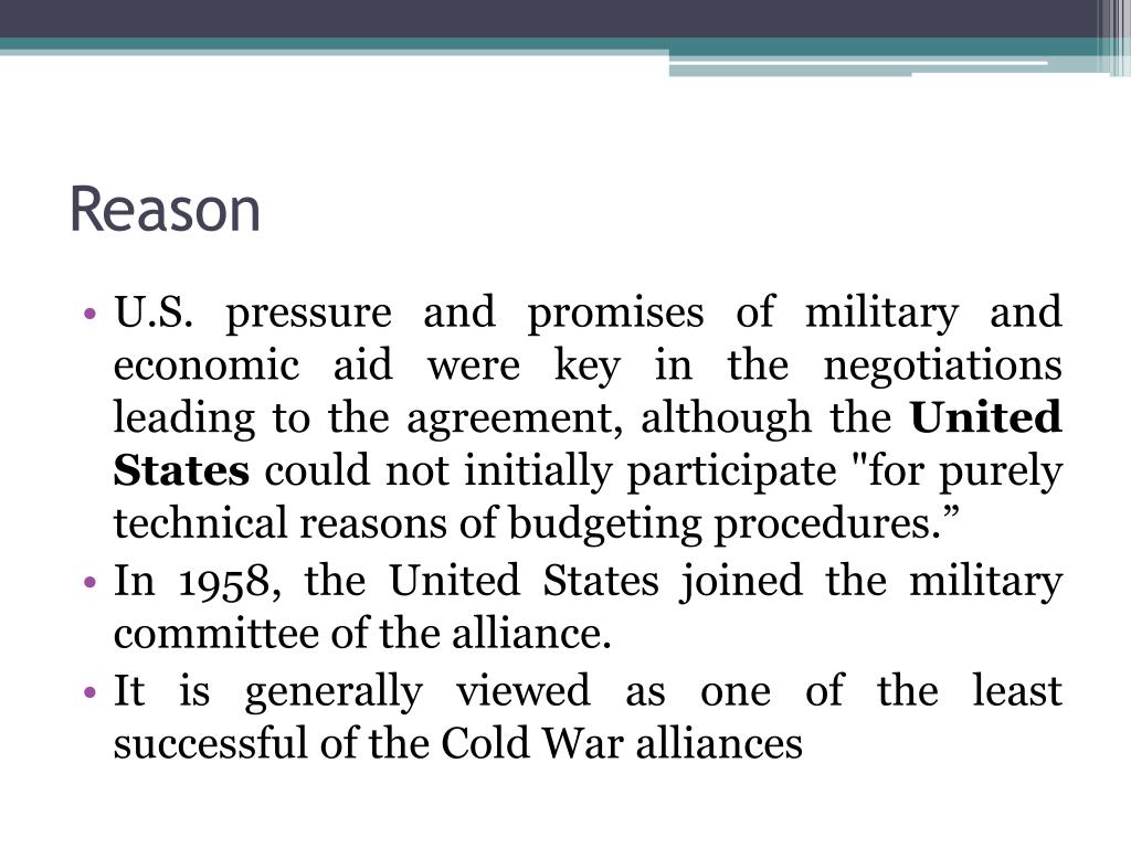 Reason • U.S. pressure and promises of military and economic aid were key in the negotiations leading to the agreement, although the United States could not initially participate "for purely technical reasons of budgeting procedures.” • In 1958, the United States joined the military committee of the alliance. • It is generally viewed as one of the least successful of the Cold War alliances
