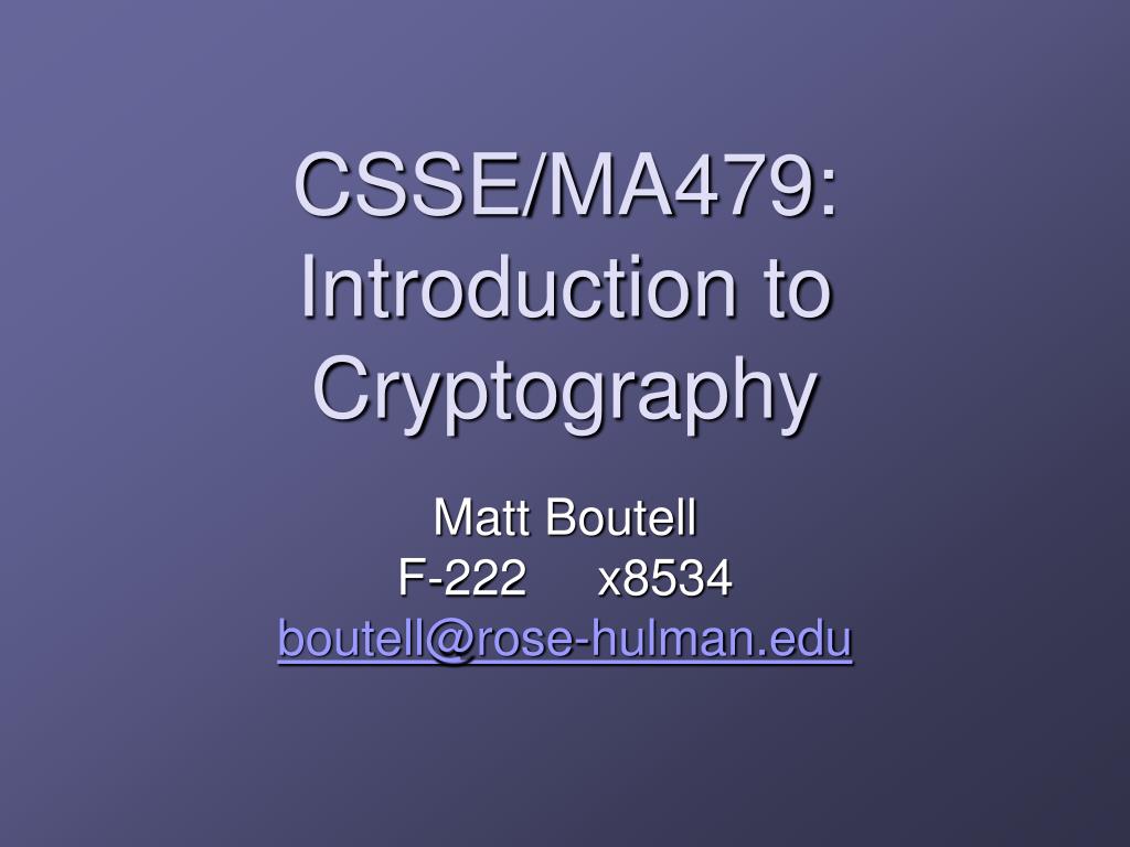 DTTF/NB479: Jouspevdujpo up Dszquphsbqiz. Nbuu Cpvufmm G-222 y8534 cpvufmm@sptf-ivmnbo.fev. (It should now be obvious whether or not you are in the right classroom…). CSSE/MA479: Introduction to Cryptography. Matt Boutell F-222 x8534 boutell@rose-hulman.edu.