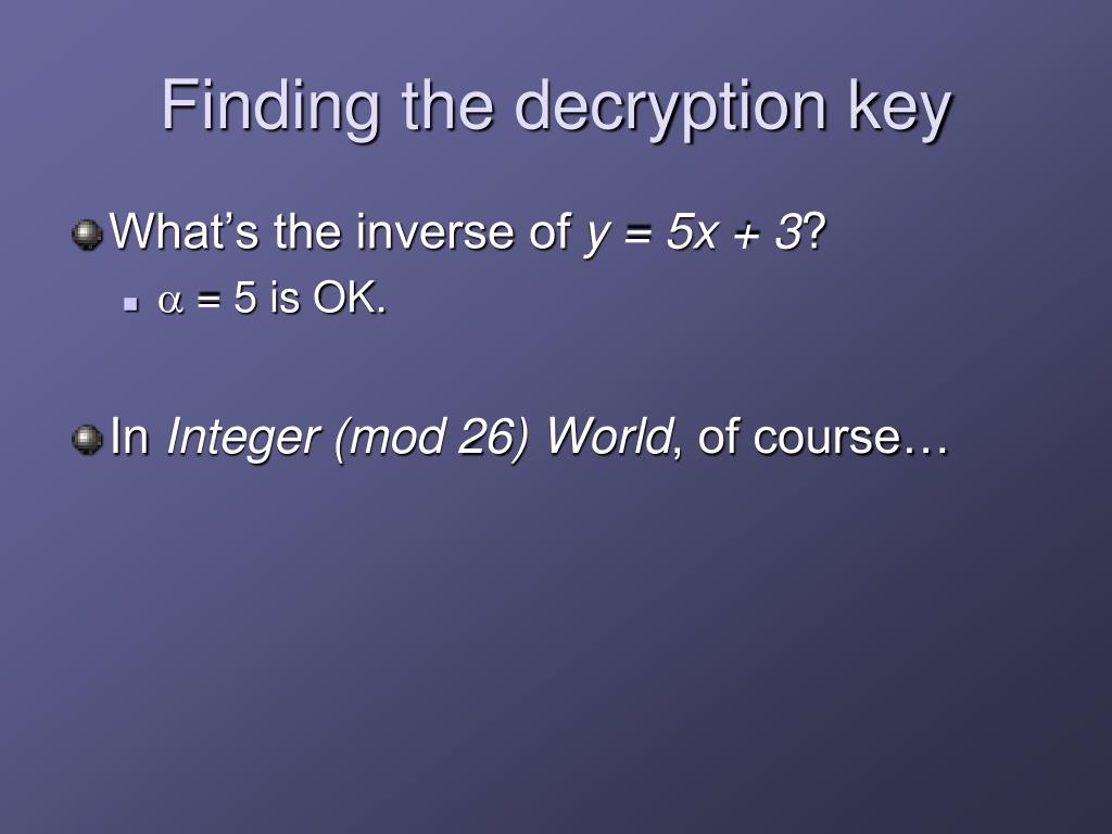 Finding the decryption key • What’s the inverse of y = 5x + 3? • a = 5 is OK. • In Integer (mod 26) World, of course…