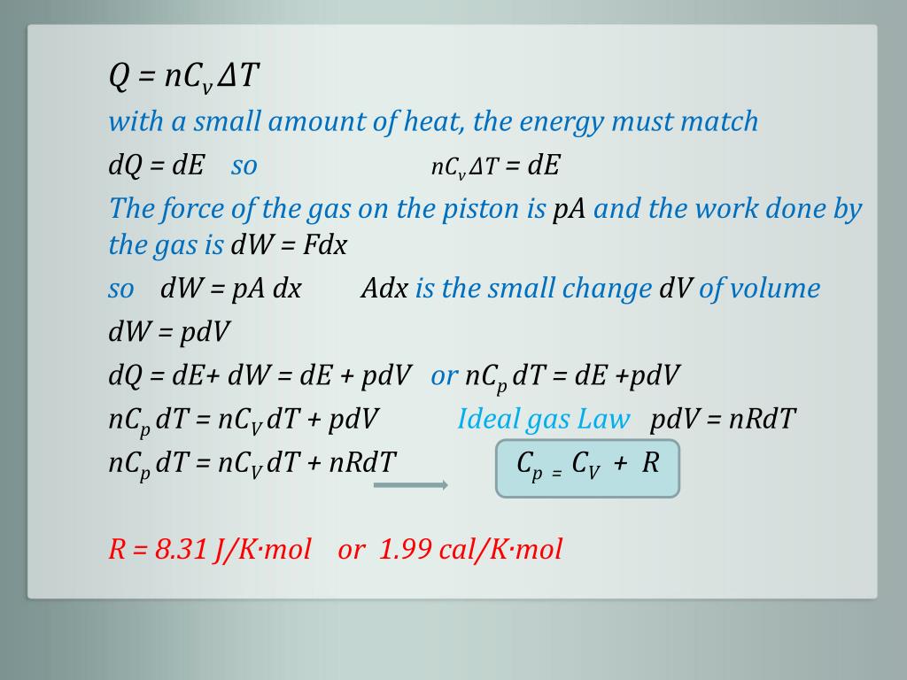 Q = nCv ΔT • with a small amount of heat, the energy must match • dQ = dE so nCv ΔT = dE • The force of the gas on the piston is pA and the work done by the gas is dW = Fdx • so dW = pAdx Adx is the small change dV of volume • dW = pdV • dQ = dE+ dW = dE + pdV or nCp dT = dE +pdV • nCp dT = nCV dT + pdV Ideal gas Law pdV = nRdT • nCp dT = nCV dT + nRdT Cp = CV + R • R = 8.31 J/K·mol or 1.99 cal/K·mol