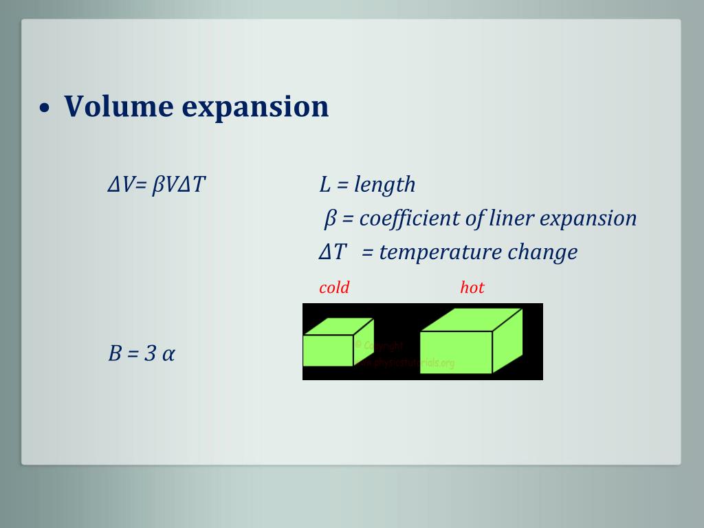 Volume expansion ΔV= βVΔT L = length β = coefficient of liner expansion ΔT = temperature change cold hot Β = 3 α