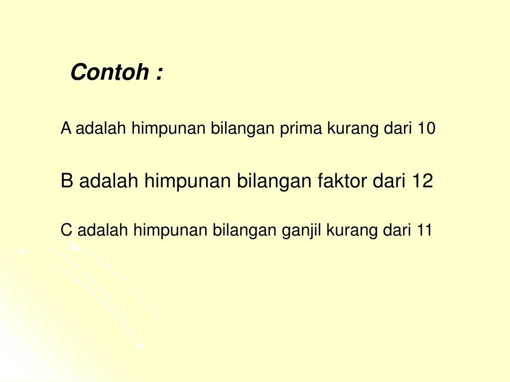 Contoh : A adalah himpunan bilangan prima kurang dari 10 B adalah himpunan bilangan faktor dari 12 C adalah himpunan bilangan ganjil kurang dari 11