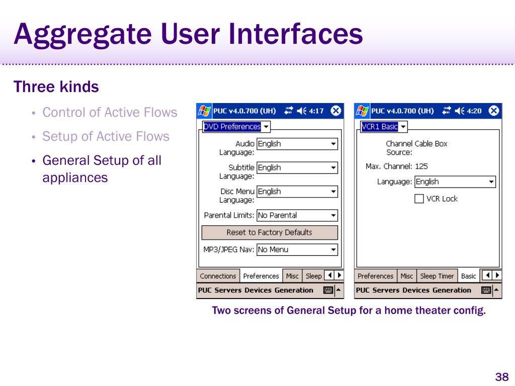 Aggregate User Interfaces • Three kinds • Control of Active Flows • Setup of Active Flows • General Setup of all appliances Two screens of General Setup for a home theater config.