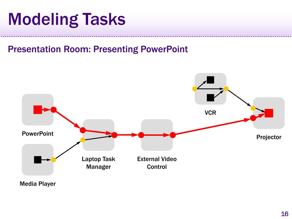 Modeling Tasks • Presentation Room: Presenting PowerPoint VCR PowerPoint Projector Laptop Task Manager External Video Control Media Player