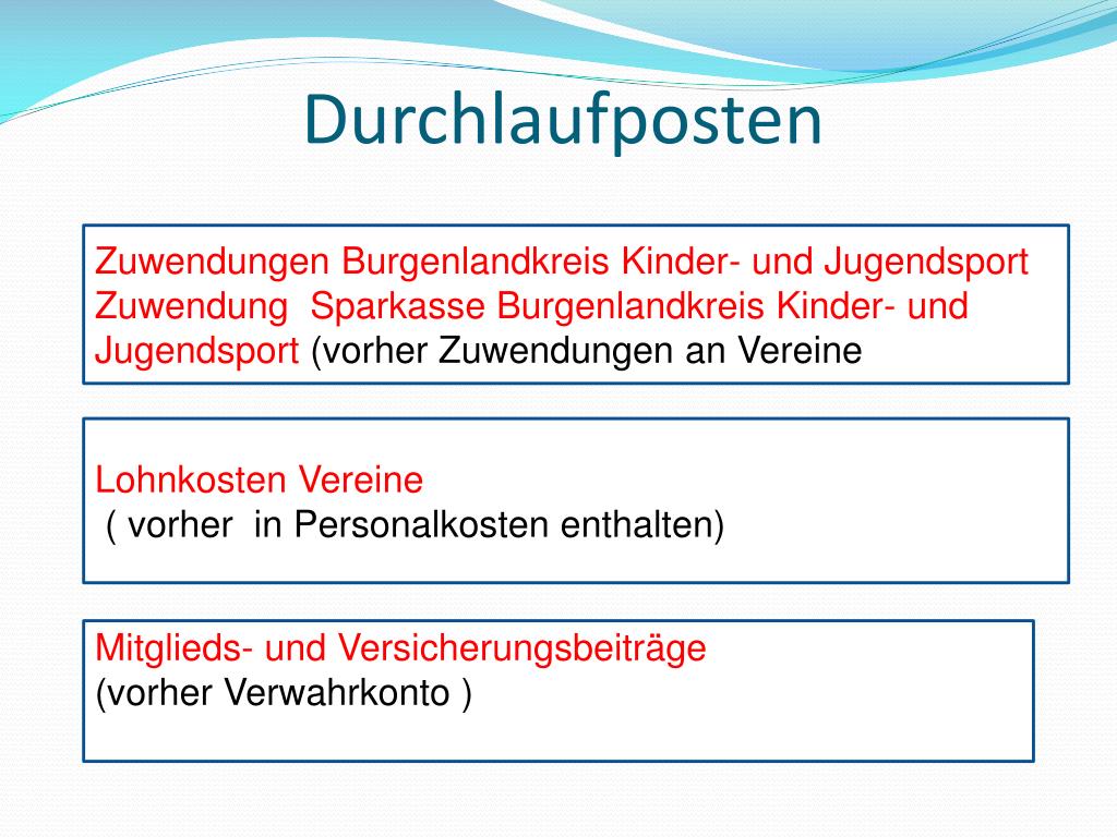 Durchlaufposten Zuwendungen Burgenlandkreis Kinder- und JugendsportZuwendung Sparkasse Burgenlandkreis Kinder- und Jugendsport (vorher Zuwendungen an Vereine Lohnkosten Vereine ( vorher in Personalkosten enthalten) Mitglieds- und Versicherungsbeiträge(vorher Verwahrkonto )